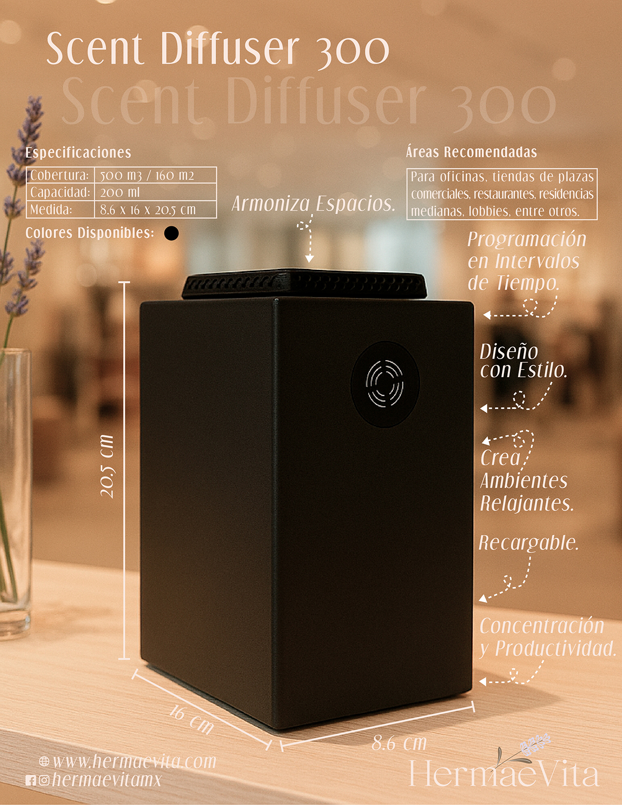 El Scent Diffuser 300 de HermaeVita está diseñado para transformar cualquier ambiente en una experiencia sensorial única. Su tecnología avanzada permite una difusión constante y uniforme de los aromas, puede programarse por medio de intervalos de tiempo, también seleccionando niveles de intensidad. Es ideal para crear atmósferas relajantes, elegantes y productivas.